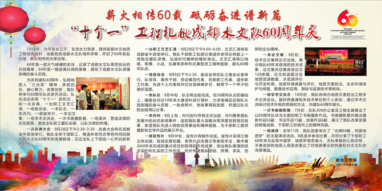 一次慶典大會:9月28日下午2:30-3:30,慶典大會將在成都金牛賓館舉行。我隊全體干部職工、離退休老同志等將共同回顧成都水文隊60周年的發展脈絡,見證全隊上下團結一心開啟嶄新的時代。